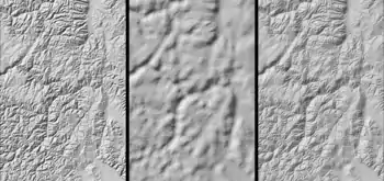An illustration of the resolution bumping technique of shaded relief, Bitterroot Mountains and Salmon River, Montana/Idaho. Left: 200 m resolution shaded relief, middle: shaded relief after 7000 m smoothing filter, right: 65%/35% mix. The original image looks uniformly rugged, while the one on the right emphasizes the larger mountains and canyons.