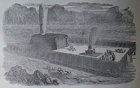 The Tabernacle also exhibited similarities with Mount Sinai. Both Mount Sinai and the Tabernacle had three separate areas with increasing levels of exclusivity—one for the people generally, one for the anointed class, and one for only the single representative of the people;[36] the tablets of the law[37] a cloud;[38] and God's presence.[39] And God spoke to Moses at both Mount Sinai and the Tabernacle.[40] But in contrast to Mount Sinai, with the Tabernacle God's presence was constant; God's presence was in their midst, no longer distant; and God's presence was no longer rooted to a fixed place.[41]