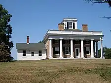 The two-story house is square, with entrances on the east, south, and north. The house is built on a foundation of fieldstone and locally produced soft red brick. The east facade features two windows flanking the door and four regularly spaced windows on the second floor. The doors on the north and south are off center, with three windows on each side—one to the east and two to the west. The walls are built with the same soft red brick as the foundation. The Greek Revival porch dominates the southern, eastern, and northern facades with large Doric columns. The roof is hipped with a slight pitch. A cupola is at the center of the house; it is large enough to serve as a bedroom. A kitchen extension was constructed at the rear on the west side in the 1890s.