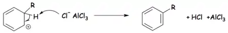 Step 3: The alkylbenzenium carbocation reacts with a tetrachloroaluminate anion, regenerating the aromatic ring and the Lewis acid and forming hydrochloric acid (HCl).