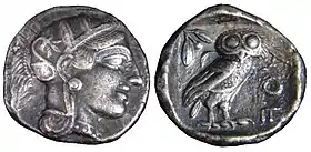 The Athenian tetradrachme was widely used in transactions throughout the ancient Greek world, including in cities politically unfriendly to Athens.[2] Athens had silver mines in state ownership, which provided the bullion. Most well known were the silver mines of Laurium in Athenian countryside.[3] The Athenian tetradrachm was stamped with the head of Athena on the obverse, and on the reverse the image of the owl of Athena, the iconographic symbol of the Athenian polis, with a sprig of olive and a crescent for the moon. According to Philochorus, it was known as glaux (λγαύξ, 'little owl')[4] throughout the ancient world[5] and "owl" in present-day English language numismatics.[6] The design was kept essentially unchanged for over two centuries, by which time it had become stylistically archaic. To differentiate their currency from the rival coinage of Aegina using the Aeginetic stater of about 12.3 grams, Athens minted its tetradrachm based on the "Attic" standard of 4.3 grams per drachma. The vast number of "owls-tetradrachms" available those days mainly from the silver mines of Laurium financed the several achievements of Athens, such as the reconstruction of the Acropolis and building the Parthenon, as well as many wars, including the Peloponnesian War.