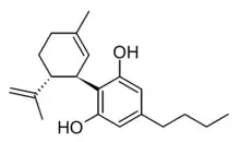 Δ9-Tetrahydrocannabutol (tetrahydrocannabinol-C4, THC-C4, Δ9-THCB, (C4)-Δ9-THC, butyl-THC) is a homologue of tetrahydrocannabinol (THC), the active component of cannabis.[1] They are only different by the pentyl side chain being replaced by a butyl side chain. Δ9-THCB, showed an affinity for the human CB1 (Ki = 15 nM) and CB2 receptors (Ki = 51 nM) comparable to that of Δ9-THC.[1] The formalin test in vivo was performed on Δ9-THCB in order to reveal possible analgesic and anti-inflammatory properties.[1] The tetrad test in mice showed a partial agonistic activity of Δ9-THCB toward the CB1 receptor.[1] The propyl analog, THCV, is a cannabinoid receptor type 1 and cannabinoid receptor type 2 antagonist,[2] while THC is a CB1 agonist. THCB has rarely been isolated from cannabis samples,[1][3] but appears to be less commonly present than THC or THCV. It is metabolised in a similar manner to THC.[4] Similarly to THC, it has 7 double bond isomers and 30 stereoisomers.[5] The Δ8 isomer is known as a synthetic cannabinoid under the code name JWH-130,[6] and the ring-opened analogue cannibidibutol is also known.[7]