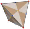 With Td, [3,3] (*332) tetrahedral symmetry, the triangular faces represent the 24 fundamental domains of tetrahedral symmetry. This polyhedron can be constructed from 6 great circles on a sphere. It can also be seen by a cube with its square faces triangulated by their vertices and face centers and a tetrahedron with its faces divided by vertices, mid-edges, and a central point.