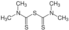 Tetramethylthiuram sulfide is an organosulfur compound with the formula ((CH3)2NCS)2S. It is a yellow solid that is soluble in organic solvents. It is the parent member of a large class of tetraalkylthiuram sulfides.[1] It is used as an activator in the sulfur vulcanization of natural and butyl rubbers.[2]