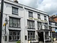 Tewkesbury claims Gloucestershire's oldest public house, the Black Bear, dating from 1308,.[9] The pub closed in 2017 and has undergoing extensive, thorough renovation 2019–2022.[10] Other notable large hostelries are the Royal Hop Pole Hotel in Church Street (which has recently been converted into a part of the Wetherspoons pub chain with the discovery of a former medieval banqueting hall in the structure), mentioned in Charles Dickens' The Pickwick Papers, the Bell Hotel, a large half-timbered structure opposite the Abbey gateway, and the House of the Nodding Gables in the High Street.