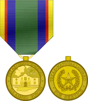 | Description | The service ribbon drape is of yellow, red, blue and green stripes. The medal is bronze with the Alamo Mission in San Antonio and the words "Texas Service Medal" and "U.S. Armed Forces" on the obverse. On the reverse is the Coat of Arms of Texas with the words "Texas National Guard" and "For Service". |