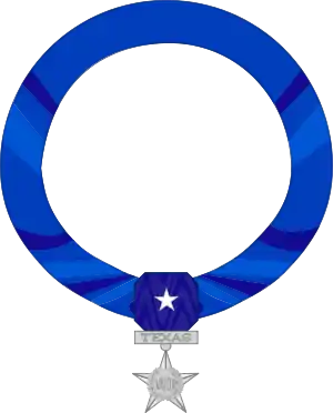 | Description | The neck ribbon is blue with a white star. The medal consists of a silver star below a bar with the word "Texas". In the center of the star, between olive and live oak branches is a circle with the word "Valor". |