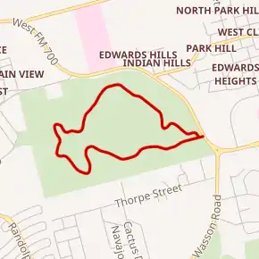 Park Road 8 begins at a T with FM 700 at the border of Big Spring State Park. The highway is a one-way, paved road. The road winds westward as it increases about 150 foot in elevation. It curves northward providing scenic overlooks of the City of Big Spring. The roadway descends eastward and intersects with itself at the entrance to the park. A .4 miles (0.64 km) length designated Park Road 8 North connects the ascending section with the descending section.