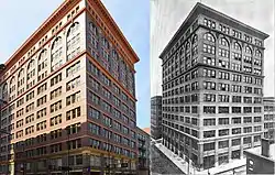 Throughout the 1800s, Cincinnati's bustling textiles industry was dispersed throughout the Third Street core of the city. At the turn of the century, Cincinnati began attempting to centralize industries into singular buildings. Thus the necessity came to build a tower dedicated to the manufacturing of garments and other textiles. Construction of this building, appropriately named the Textile Building, began in 1904. Local architect Gustav W. Drach was tapped to design the structure, and he incorporated aspects of both the Chicago school of architecture and the renaissance revival style into his plans. At the time, Drach was considered to be one of Cincinnati's most versatile architects, designing both elegant residences and towering utilitarian structures. In 1976, Textile Building was included as a part of the West Fourth Street Historic District's admission to the National Register of Historic Places (amended August 13, 1979).[1] By the 1980s, the Textile Building was owned by Duke Realty, who undertook an extensive renovation of the building in 1986. The building was sold in the 1990s to a real estate syndicate, and sold again to K-B Opportunity Fund I, which is owned by Koll-Bren of Newport Beach. On March 1, 2016, the Textile Building was purchased for $12 million by the national historic property developer Hudson Holdings. The firm plans to preserve the historic integrity of the building, and continue to operate it as office space.