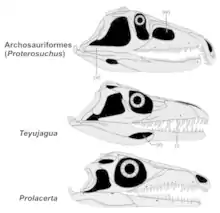 Teyujagua (named for Teyú Yaguá, a legendary beast from local Guaraní mythology) is an extinct genus of small, probably semi-aquatic archosauromorph reptile that lived in Brazil during the Early Triassic period. The genus contains the type and only known species, T. paradoxa. It is known from a well-preserved skull, and probably resembled a crocodile in appearance. It was an intermediary between the primitive archosauromorphs and the more advanced Archosauriformes, revealing the mosaic evolution of how the key features of the archosauriform skull were acquired. Teyujagua also provides additional support for a two-phase model of archosauriform radiation, with an initial diversification in the Permian followed by a second adaptive radiation in the Early Triassic.[1]
