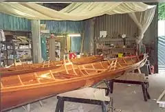 The Thames skiff owes its origins to the clinker boat building technique, of over-lapping timber planking, that's known to have existed in the region from before the 6th century Anglo-Saxon Snape and Sutton Hoo ship burials. Many of the terms used for parts of the skiff are of Germanic origin – "tholes", "thwarts",[1] and "sax". Planks on either side of a wooden keel are laid down following the outline of a sham (temporary pattern) placed across the keel. The planks are nailed in place and then a transverse strengthening framework of ribs is added. Oars (or blades) are held in place by wooden thole pins at the side of the boat rather than rowlocks or outriggers. The thole pins are designed to give way if too much pressure is put on them, thus protecting the boat itself from damage. The thwart, or seat, is fixed rather than sliding as in modern boats. The sax runs round the top of the boat to strengthen and protect it.[2] Blades are made of wood with leather collars.