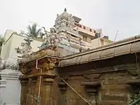 The temple priests perform the puja (rituals) during festivals and on a daily basis. Like other Shiva temples of Tamil Nadu, the priests belong to the Shaiva community, a Brahmin sub-caste. The temple rituals are performed six times a day; Ushathkalam at 5:30 a.m., Kalasanthi at 8:00 a.m., Uchikalam at 10:00 a.m., Sayarakshai at 5:00 p.m., Irandamkalam at 7:00 p.m. and Ardha Jamam at 8:00 p.m. Each ritual comprises four steps: abhisheka (sacred bath), alangaram (decoration), naivethanam (food offering) and deepa aradanai (waving of lamps) for both Thanthoneeswarar and Amman. The worship is held amidst music with nagaswaram (pipe instrument) and tavil (percussion instrument), religious instructions in the Vedas (sacred texts) read by priests and prostration by worshippers in front of the temple mast. There are weekly rituals like somavaram (Monday) and sukravaram (Friday), fortnightly rituals like pradosham and monthly festivals like amavasai (new moon day), kiruthigai, pournami (full moon day) and sathurthi.[6] Commemorating the event of Kanthimathi giving bangles to the Naga deity during her pregnancy, a bangle festival is celebrated during the Tamil month of Thai.[7]