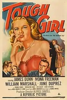 That Brennan Girl, also known as Tough Girl, is a 1946 melodrama film[1] produced and directed by Alfred Santell and starring James Dunn, Mona Freeman, William Marshall, and June Duprez. The story concerns a young woman raised in an unwholesome environment who joins a confidence racket run by one of her mother's friends. She agrees to marry the victim of one of her scams, becomes a war widow, and is left to raise a baby, but abandons it each evening to go out dancing. After the child suffers an accident in her absence, she is charged with child neglect and loses custody. She mends her ways by devotedly caring for an abandoned infant and meets up again with the con man, who has also reformed after a prison stint, and together they build a new life. The film was the last work of director Santell and the last leading role for actor Dunn.[2]