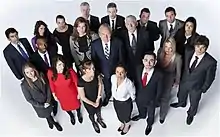![]() Promo group shot of Alan Sugar, Nick Hewer and Karren Brady standing amongst the candidates for series 8 | |