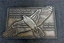 The themes of romance and death in The Awakening aid Chopin's feminist intent of illuminating the restrictive and oppressive roles of women in Victorian society. Edna's longing for Robert Lebrun and affair with Alcée Arobin explicitly show Edna's rejection of her prescribed roles as housewife and mother as she awakens to her sexuality and sense of self. Edna has an emotional affair with Robert, who leaves in order to avoid shaming her in society. Afterwards, Edna has a physical affair with Alcée. Through these affairs, Edna exercises agency outside of her marriage and experiences sexual longing for the first time. However, through these affairs Edna also discovers that no matter which man she is with, there is no escape from the general oppression women face; Edna's society has no place for a woman like her, as she must either be an exemplary housewife and mother like Adèle Ratignolle or an isolated outsider like Mademoiselle Reisz.[6] Edna's ultimate decision to commit suicide at the end of the novel exemplifies how few options women had in society at this time. Leaving society all together was Edna's way of rejecting and escaping this oppressive dichotomy. One critic stated that the book leaves one sick of human nature, while another one stated that the book is morbid because it is about an unholy love that tested traditional gender roles of the late 1800s and that the book belongs to the overworked field of sex fiction.[7] However, this was the original criticism of the book. When the book was reevaluated years later it was then recognized as canonical due to the feminist theme. This later then led to many other women writers of the Nineteenth century to become recognized for literary themes on gender roles viewed by their regions, culture, or religion.[7]