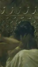 Imogen Hart points out that Herodotus describes the event taking place in the heart of a village, not an auction house, with the men of the village standing in a circle around the women, not a line.[26] She further observes that Long's painting however, is set in a building reminiscent of a modern auction house, the men gathering in a line, not a circle. Bohrer attributes this divergence of Herodotus’ translation to Long's own artistic freedom or reimagining of the fable,[11] purposely abstracting the content of Herodotus to be more resonant with his 1875 audience. Hart attributes this divergence with Herodotus to Long's reading and favour for George Swayne's translation and commentary on Herodotus,[26][27] which contains this linear arrangement and equal arrangement of the brides as depicted by Long.[27] The Graphic notes Long's fondness for Swayne's commentary on Herodotus.[3] It is argued that Long chose this method of composition because it better aligns the women (brides) with the decimal currency, with Hart arguing that the linear arrangement is more like a numerical scale that converts the brides to numerals.[28] She posits that a core feature of the painting is Long's purposeful obscuring of the faces of the ugliest and most beautiful brides.[28] By doing this Long is argued to address the philosophical problem of the difficulty or impossibility of assigning an objective worth to beauty.[29][19][28] Long was understood to put forward that the most beautiful and ugly things are deeply subjective and personal.[28] The additional choice to have the women seated at an equal level has been observed to establish an impactful linear equality, not hierarchy, Hart argues that this feature of the women's seating is key to understanding Long's critique of the Babylonian Ritual.[28] The first bride is facing away from the viewer in the detail, and in doing so the viewer is not able to see her face, but can see the linear equality of the bride's seating positions.