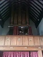 The organ itself inside the church. Taken from below the ground, the organ is above a case of stairs behind a door locked to the general public.