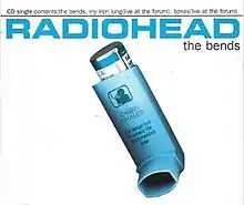 More than a year after the release of The Bends, the title track was released as a single by Parlophone in Ireland on 26 July 1996,[63] the same month when Radiohead began recording their third album OK Computer (1997).[64] The single was limited to only 2,000 copies and included two live versions of "My Iron Lung"[lower-alpha 2] and "Bones", both recorded at the London Forum on 24 March 1995.[65][57][66] It was later included on Amazon.[67] The accompanying artwork features a graphic of an inhaler created by Stanley Donwood and Yorke; the latter is credited under the pseudonym "The White Chocolate Farm".[68] The graphic also appeared on occasion in other works by Donwood.[69] Written on the back of the CD single: