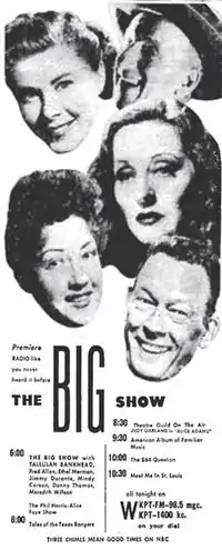 The Big Show, an American radio variety program featuring 90 minutes of comic, stage, screen and music talent, was aimed at keeping American radio in its classic era alive and well against the rapidly growing television tide. For a good portion of its two-year run (November 5, 1950 – April 20, 1952), the show's quality made its ambition seem plausible.[1]