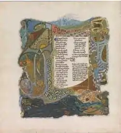 The manuscript consists of 26 unbound vellum sheets[2] and was intended to be a combination of illuminated pages and lists of the dead. Also included were writings and sayings of Irish Nationalist leaders, with the illuminations depicting regions and events from recent and ancient Irish history and mythology. One example is the illumination entitled "The Men of the Harbours", which commemorated Eskine Childers and 1914 arrival of the Asgard at Howth.[3] Others commemorated are Kevin Barry, Cathal Brugha, Michael Collins, Terence MacSwiney, Kevin O'Higgins, Patrick Pearse, Joseph Plunkett, and Roger Casement.[1]