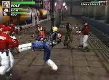 Controls in The Bouncer are similar to those in the Tobal series.[3] Certain buttons denote high, middle, and low attacks, whilst others are used for jumping attacks, blocking, and special moves. Players have a health meter during gameplay, which, if depleted, means the player dies. Players also have a limited number of guard points available to them, although this is not represented by an onscreen meter. As the player blocks, the number of guard points diminish. When they are gone completely, the player can no longer block.[4]