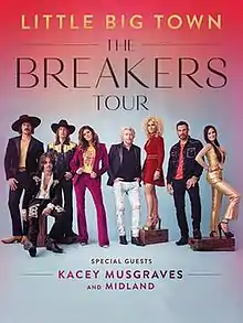 The Breakers Tour was the fourth headlining tour by American country music group, Little Big Town, and was in support of their eighth studio album The Breaker (2017). The tour began on September 28, 2017, in Manchester, England[1] and will conclude on March 2, 2019, in Abbotsford, British Columbia.[2] The set is largely composed of songs from the band's two most recent albums (The Breaker and 2014's Pain Killer) alongside covers and some of the best known hits from their back-catalogue.