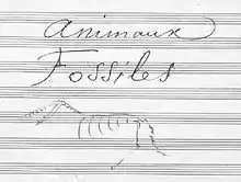 Title page to "Fossils" in the manuscript including drawing by the composer