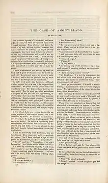 "The Cask of Amontillado" (sometimes spelled "The Casque of Amontillado" [a.mon.ti.ˈʝa.ðo]) is a short story by American writer Edgar Allan Poe, first published in the November 1846 issue of Godey's Lady's Book. The story, set in an unnamed Italian city at carnival time in an unspecified year, is about a man taking fatal revenge on a friend who, he believes, has insulted him. Like several of Poe's stories, and in keeping with the 19th-century fascination with the subject, the narrative revolves around a person being buried alive – in this case, by immurement. As in "The Black Cat" and "The Tell-Tale Heart", Poe conveys the story from the murderer's perspective.