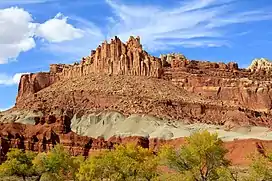 The uppermost portion of The Castle is composed of hard, jointed Wingate Sandstone, which is great for rock climbing, and is believed to have formed about 200 million years ago. This overlays the exposed gray-green layer of the Chinle Formation which was laid down as volcanic ash about 225 million years ago, and beneath Chinle is the Moenkopi Formation (about 245 million years old), all of which date to the Triassic.[3] Long after the sedimentary rocks were deposited, the Colorado Plateau was uplifted relatively evenly, keeping the layers roughly horizontal, but Capitol Reef is an exception because of the Waterpocket Fold, a classic monocline, which formed between 50 and 70 million years ago during the Laramide Orogeny.[4]