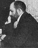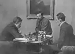 It is very likely that Faven based his depiction of Tarrasch on this photo. If the picture is from the early 1900s, then the absence of Capablanca, Rubinstein and Alekhine in the painting are explicable. On the other hand, in that case it would be surprising that Teichmann and Pillsbury seem absent.[5] |