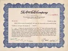 Certificate of Purchase Class A Stock for 20 Shares of the Coca-Cola Company, issued February 20, 1929