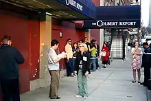 The Colbert Report was taped and broadcast four nights a week, Monday–Thursday.[15] The show's taping studio, at 513 W. 54th Street in New York City's Hell's Kitchen neighborhood, was used for The Daily Show until July 2005,[5] and has a capacity of 150.[25] NEP Studio 54 on 54th Street is owned by NEP Broadcasting which is New York City's largest production facility and also owns The Daily Show set at NEP Studio 52 two blocks south on 52nd Street. Aside from the set, the show's production offices have been described as "loft-like" and "all overhead pipes and exposed brick."[17] Following the show's conclusion, the building was used for The Nightly Show with Larry Wilmore.[26]