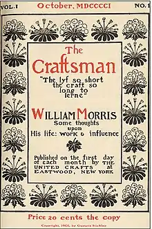 The Craftsman was founded by Stickley in October 1901. A key figure in the early years was art historian and Syracuse University professor Irene Sargent.[1][2] She wrote most of the magazine's first three issues herself —including the inaugural issue's cover story on William Morris — and thereafter usually wrote each issue's lead article while acting as managing editor and layout designer.[1][2][3][4] Her writings in The Craftsman, along with the architectural designs the magazine published, helped to shape public understanding of the American Arts and Crafts aesthetic and contributed greatly to the magazine's success.[3]
