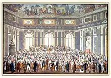 The first performance the next day was a private affair, but hundreds of people crowded into the street around the old Schwarzenberg Palace at the New Market to hear this eagerly anticipated work. Admission was by invitation only.[1] Those invited included wealthy patrons of the arts, high government officials, prominent composers and musicians, and a sprinkling of the nobility of several countries; the common folk, who would have to wait for later occasions to hear the new work, so crowded the streets near the palace that some 30 special police were needed to keep order. Many of those lucky enough to be inside wrote glowing accounts of the piece. In a letter to the Neue teutsche Merkur, one audience member wrote, "Already three days have passed since that happy evening, and it still sounds in my ears and heart, and my breast is constricted by many emotions even thinking of it."