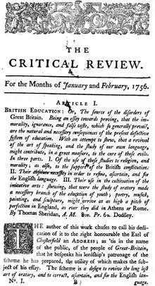 The Edinburgh printer Archibald Hamilton started publishing The Critical Review in 1756 with Tobias Smollett as its first editor. The content was mainly book reviews, which were often long and favourable, with copious verbatim quotations.[1] The Tory and High Church perspectives of contributors came through clearly, however. Besides Smollett, the writers of the first two volumes have been identified as John Armstrong, Samuel Derrick, Thomas Francklin, and Patrick Murdoch.[2]