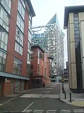 The Cube is a 25-storey mixed-use development in the centre of Birmingham, England. Designed by Ken Shuttleworth of Make Architects, it contains 135 flats, 111,500 square feet (10,359 m2) of offices, shops, a hotel and a 'skyline' restaurant. It is the final phase of The Mailbox development.