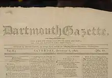 The first articles of the Dartmouth Gazette focused on local news, but also printed two pages of foreign and national news. The Gazette's aim was to print news articles that were of practical use to readers, often covering information about local events, laws that would affect local residents, and imminently dangerous sicknesses.[4] The first issue of the Dartmouth Gazette contains a poem and short story signed by "Icarus", who was later found to be Daniel Webster.[5] Issues of the Dartmouth Gazette demonstrate that the newspaper provided a record of local events relating both to the town and to the college. For example, "the second issue has a long and rather tediously written discussion of New Hampshire school laws, and a report of Dartmouth's Commencement activities from Wednesday, August 28, 1799."[4] It is also clear that mischief consistent with undergraduate students was not eliminated from the Dartmouth Gazette entirely by the editing process.