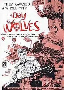 The Day of the Wolves is a 1971 heist movie starring Richard Egan and directed, written and produced by Ferde Grofe Jr. the son of the renowned composer who had previously worked in the Philippine film industry. It was the first movie to be made on location in the new town of Lake Havasu City, Arizona. This was the last feature film made by actress Martha Hyer and was also the last film made by actor Percy Helton who died about five months after filming wrapped (Helton's last released film was Legend of the Northwest, released in 1978 but made in the 1960s and shelved for a decade).