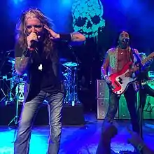 The band toured in 2013, including opening for ZZ Top[9] and joining Aerosmith on their Australian and New Zealand tour.[10] This was followed by the 25-date Rockstar Energy Drink Uproar Festival in August and September 2013 (with Jane's Addiction and Alice in Chains, among others).[11] These shows were performed by the first full lineup of the band, which consisted of Lowy and Stevens along with drummer Frank Ferrer, guitarist Richard Fortus, bassist Marco Mendoza (Whitesnake/Thin Lizzy), and pianist Dizzy Reed (from Guns N' Roses). Lead singer Stevens performed for a while with casts on his hand and leg as a result of an injury sustained when escaping from a crocodile on a fishing excursion in Australia.[12]