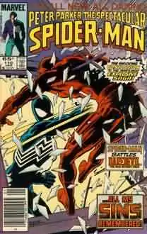 ![]() Cover of Peter Parker, the Spectacular Spider-Man 110 (Jan 1986), the issue containing the final part of the storyline. Art by Rich Buckler featuring Spider-Man fighting Daredevil. | |