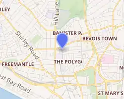 The site on which the ground was built was described in Philip Brannon's Picture of Southampton, published in 1850, as "a lovely dell with a gurgling stream and lofty aspens";[5] the stream is the Rollsbrook which flows out of Southampton Common, running parallel to Hill Lane before now disappearing under Commercial Road and the Central Station, from where it is conduited under Southampton Docks into Southampton Water. The land had been purchased in the 1880s by the Didcot, Newbury and Southampton Railway to enable them to continue their line from Winchester via Twyford, Chandlers Ford, a tunnel at Chilworth and Shirley where it was to pass to the north-east of what is now St James' Park and St. James' Church. From here the line would have travelled south across Hill Lane to run through the dell and onto an embankment leading to a viaduct over Commercial Road and the London and South Western Railway line before terminating on the Western Esplanade, north of the Royal Pier.[6][7] The dell was stripped of vegetation and the stream channelled into a conduit with work started on the embankment, which survives behind property to the north of Commercial Road but was never used, and the viaduct which was part built but later demolished. The project was abandoned at this point and agreement reached to connect to the London and South Western Railway at Shawford Junction with running rights into Southampton.