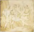 Raphael made numerous preparatory sketches or drafts as his idea for the composition evolved (several are on Wikimedia Commons - see link below). He started with the subject of a Lamentation over the dead Christ,[9] similar to the famous painting of the same name by his teacher Pietro Perugino. He moved from that idea to an Entombment of Christ,[10] perhaps inspired by an ancient Roman sarcophagus relief of Meleager from Greek mythology, Michelangelo's Entombment or the print of the Entombment by Mantegna.[11] Looking through his studies, we can see that this long period of evolution gave Raphael the opportunity to put into practice much of the new style and techniques he had been developing from his studies of Renaissance masters Leonardo da Vinci and Michelangelo as well as others artists of the period. The two design phases may broadly be labeled ‘Perugian’ and ‘Florentine’.[6] The significant change of subject from a Lamentation to an Entombment affected the character of the painting on the whole because it changed from a more iconic Pietà to a subject with more narrative interest.[12]