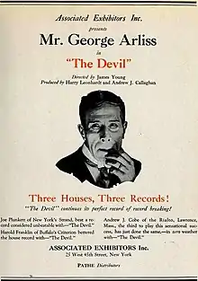 The Devil is a surviving 1921 silent drama film directed by James Young and starring stage actor George Arliss in a film version of his 1908 Broadway success of Ferenc Molnár's play, The Devil (aka Az ordog) [1].[2][3] Long thought to be a lost film, a print was discovered in the 1990s and restored by the Library of Congress.