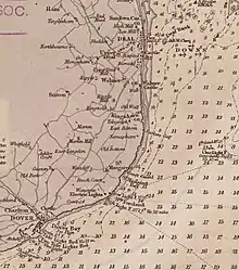 The Downs is a roadstead (area of sheltered, favourable sea) in the southern North Sea near the English Channel off the east Kent coast, between the North and the South Foreland in southern England. In 1639 the Battle of the Downs took place here, when the Dutch navy destroyed a Spanish fleet which had sought refuge in neutral English waters. From the Elizabethan era onwards, the presence of the Downs helped to make Deal one of the premier ports in England, and in the 19th century, it was equipped with its own telegraph and timeball tower to enable ships to set their marine chronometers.
