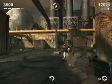 The game offers two methods of control. The first, and the one upon which the game was primarily marketed,[4] is a system developed specifically for the game and uniquely adapted for touchscreen devices. To shoot, the player taps the screen with two fingers and the player character fires at the middle point between the two taps.[5][6][7] To zoom, the player pinches and expands their fingers on the screen.[7] To move, the player taps on the screen where they want to go and the character automatically moves around obstacles until he reaches the designated spot.[6] To strafe, the player swipes left or right on the screen using two fingers.[6] To look around, the player swipes in any direction with one finger, although there is also a shortcut button for instant 180 degree turns.[6] To switch weapons, the player taps on the character's weapon. A more traditional touchscreen first-person shooter setup is also available, with two virtual joysticks, one for moving, one for shooting.[8]
