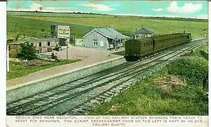 The Dyke Station opened as the terminus for the standard gauge railway line which ran from Dyke Junction Station (now known as Aldrington railway station)[5][6] to 200 feet below the summit of Devil's Dyke.[7] The line was opened by the Brighton and Dyke Railway Company to serve what was at the time a very popular tourist destination, boasting two bandstands, an observatory, a camera obscura and fairground rides. The station itself was equipped with basic facilities to accommodate tourists and postcards of the station buildings reveal a converted railway carriage with shack attached bearing the sign "Tea and Cakes".