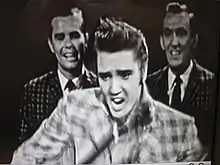On September 9, 1956, Presley made his first appearance on The Ed Sullivan Show (after earlier appearances on shows hosted by the Dorsey Brothers, Milton Berle, and Steve Allen), even though Sullivan had vowed never to allow Presley on the show.[19] According to Sullivan biographer Michael David Harris, "Sullivan signed Presley when the host was having an intense Sunday-night rivalry with Steve Allen. Allen had the singer on July 1 and trounced Sullivan in the ratings. When asked to comment, [Sullivan] said that he wouldn't consider presenting Presley before a family audience. Less than two weeks later he changed his mind and signed a contract."[20]
