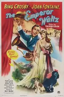 The Emperor Waltz (German: Ich küsse Ihre Hand, Madame) is a 1948 American musical film directed by Billy Wilder and starring Bing Crosby and Joan Fontaine.[5][6] Written by Wilder and Charles Brackett, the film is about a brash American gramophone salesman in Austria at the turn of the twentieth century who tries to convince Emperor Franz Joseph to buy a gramophone so the product will gain favor with the Austrian people. The Emperor Waltz was inspired by a real-life incident involving Franz Joseph I of Austria. Filmed in Jasper National Park in Canada,[7] the picture premiered in London, Los Angeles, and New York in the spring of 1948, and was officially released in the United States July 2, 1948. In 1949, the film received Academy Award nominations for Best Costume Design and Best Music, as well as a Writers Guild of America Award nomination for Best Written American Musical.[8]