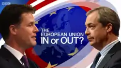 The European Union: In or Out is a British television debate that was first broadcast on BBC Two on 2 April 2014.[1] The hour long live debate between Nick Clegg and Nigel Farage was hosted by David Dimbleby.[2] Questions came from the audience, with an equal number of people for and against British membership of the European Union.