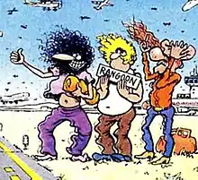 The majority of the comic books consist of one or more multi-page stories together with a number of one-page strips; many of the latter have a one-row skit featuring Fat Freddy's Cat at the bottom of the page. Issues #8-10 contained only the long-form story "The Idiots Abroad", which The Comics Journal listed as #44 of the "100 Greatest Comics of the Century."[5] The UK newspaper The Guardian said of a 2003 reprint of the story that, "The graphic quality is, even in slightly muddy reproduction, astonishing. Depictions of various European cities recall Hergé in their accuracy and detail ... As for the subject matter, considering the dates of composition, it has hardly dated."[6]